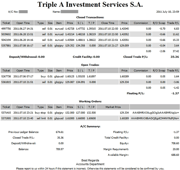 10日のZuluTrade×ZuluKingdomの資産運用実践成績